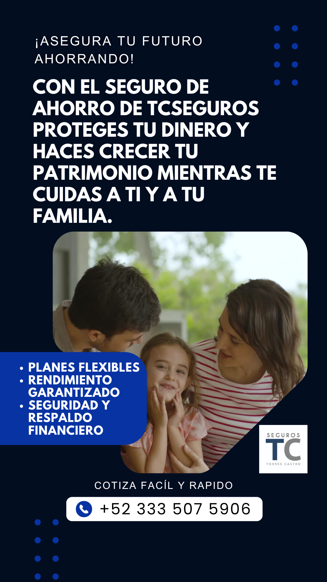 El Seguro de Ahorro de TCSeguros es una forma práctica y segura de cuidar tu dinero y hacer crecer tu patrimonio sin perder de vista lo más importante: tu familia. Con planes flexibles, rendimiento garantizado (según plan) y respaldo financiero, estás a un paso de cumplir tus metas.